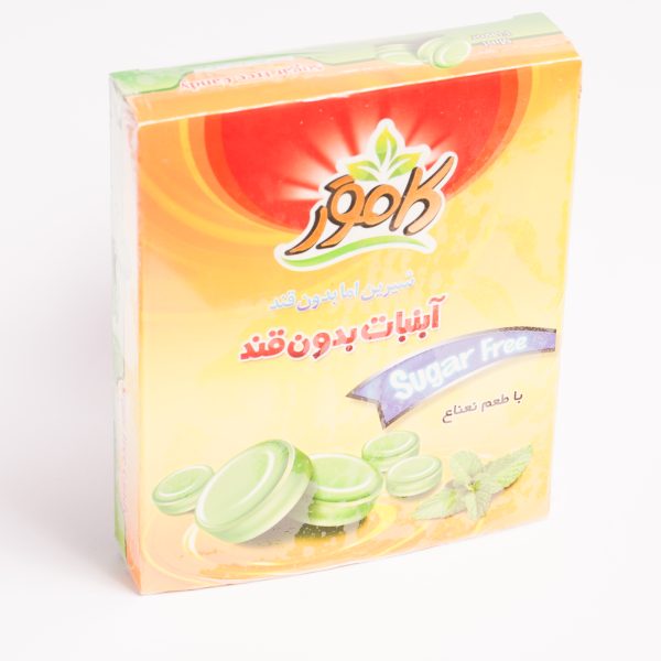 آبنبات بدون قند کامور با طعم نعنا مناسب افراد دیابتی و رژیمی. شیرین شده با ایزومالت، صفر کالری شکر و خوشبوکننده دهان.