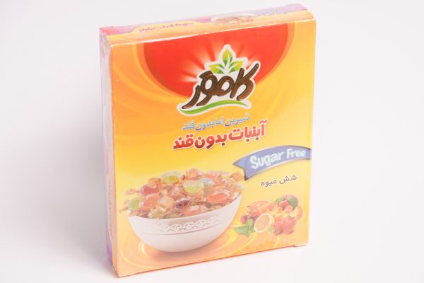 آبنبات بدون قند کامور با طعم شش میوه: مناسب افراد دیابتی و رژیمی. شیرین شده با ایزومالت، صفر کالری شکر و با طعمهای متنوع میوهای.