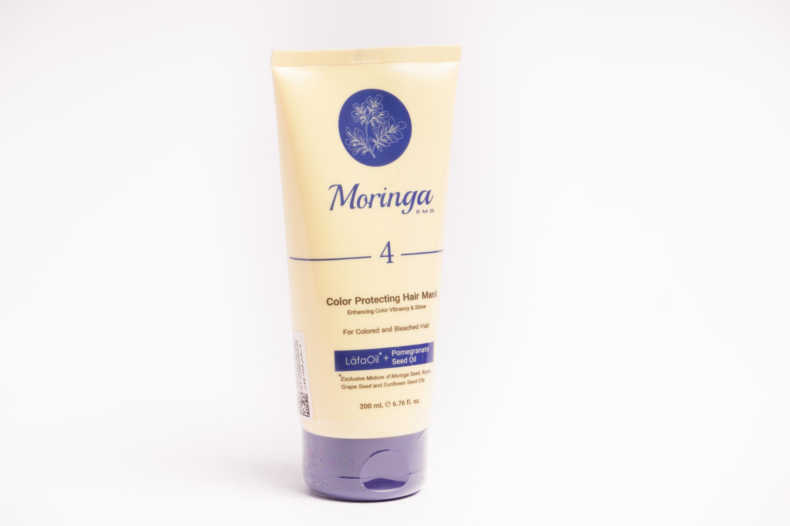 ماسک مو مورینگا اِمو شماره ۴: ترمیم کننده قوی و تثبیت کننده رنگ مو. حاوی لافااُیل، روغن هسته انار و ویتامینهای A و E. افزایش دوام و درخشندگی رنگ، رفع کدری، موخوره و خشکی موهای رنگ شده و دکلره.
