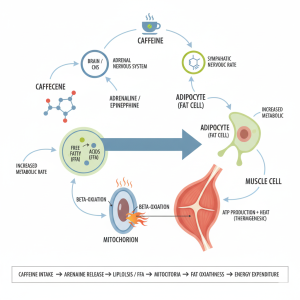 وقتی کافئین وارد بدن میشه، سیستم عصبی سمپاتیک را فعال میکنه و باعث ترشح هورمون نورآدرنالین می شه. این هورمون به سلول های چربی دستور می ده تا چربی های ذخیره شده رو آزاد کنن تا بدن بتونه از ان ها به عنوان سوخت استفاده کنه. در همین زمان، بافت چربی قهوه ای که نقش اصلی اش تولید گرماست، توسط کافئین تحریک می شه. این بافت به جای ذخیره انرژی، آن را به گرما تبدیل میکنه و دمای بدن را کمی بالا میبره.